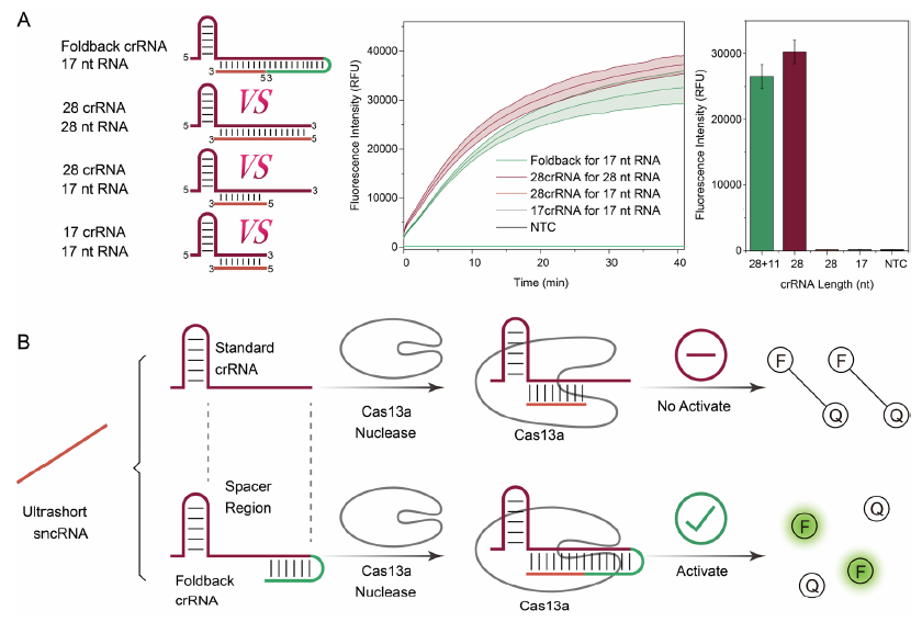 小非編碼RNA (Small noncoding RNA, sncRNA)是生命活動的重要調控因子,在基因表達調控、生物發育、代謝和疾病中發揮著重要作用。然而,目前許多現有檢測方法對<22個核苷酸(nt)的超短sncRNA的檢測特異性較差。CRISPR/Cas13a系統是一種很有前景的核酸檢測技術,可在不受基因組DNA干擾的情況下直接檢測sncRNA。目前的報告表明,標準CRISPR/Cas13a系統檢測28 nt 靶標RNA時可在20分鐘內迅速產生強烈的熒光信號,然而檢測超短靶標RNA時的檢測性能急劇下降。