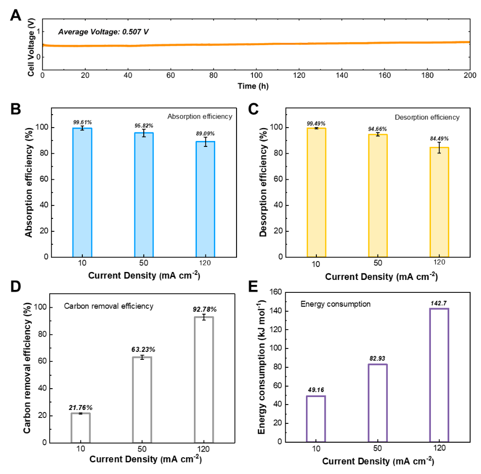 圖2:氧化還原解耦的電化學碳捕集技術性能測試。A、200小時穩定性測試;B、不同電流密度下吸收效率;C、不同電流密度下解吸效率;D、不同電流密度下系統碳移除率;E、不同電流密度下系統捕集能耗。