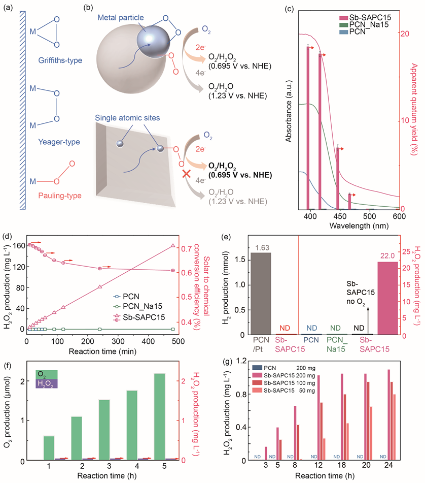 1.開發了一種Sb單原子光催化劑(Sb-SAPC),用于可見光照射下水和氧氣混合物中通過光催化合成H2O2。