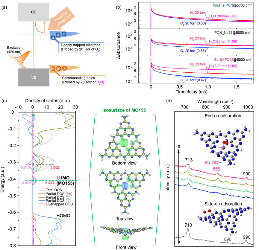 作者進一步用不同氣氛下的瞬態吸收譜作為OER / ORR的探針(圖5a-b)。在N2, O2和H2O氣氛(20 Torr)下, 5000 cm-1波長的脈沖光激發下PCN, PCN_Na15和Sb-SAPC15之間的瞬態吸收衰減的比較說明,Sb-SAPC15所生成的電子和空穴可以分別高效地與氧氣和水反應。Melem_3Sb3+的總態密度(TDOS), 分狀態密度(PDOS)和狀態重疊密度(ODOS)與LUMO等值面(Isovalue為0.05) 表明,電子在光激發的時候主要被累積到Sb原子上,利于氧還原反應(圖5c)。通過原位拉曼光譜的數據表明(圖5d), O2分子在孤立的Sb原子位點的吸附是端對端吸附(end-on), 這選擇性促進了Sb-μ-過氧化物(Sb-OOH)的形成,避免了以往利用氮化碳材料在melem位點處形成的側面(side-on)吸附態, 從而減少了氧氧鍵的斷裂,為H2O2的生產提供了高選擇性的2e- ORR途徑。