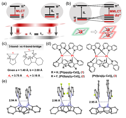 Figure 1.(a) Illustration of the orbital diagrams and decay dynamics (krandknr) of3MLCT and3IL excited states. (b) The formation and orbital diagrams of MMLCT excited states for square-planar Pt(II) complexes. (c) Trigonometry analysis of the intermetallic distance dependent on the bridging ligand. (d) Chemical structures and (e) perspective view of the single crystal structures of the dinuclear Pt(II) complexes1?3in this work.