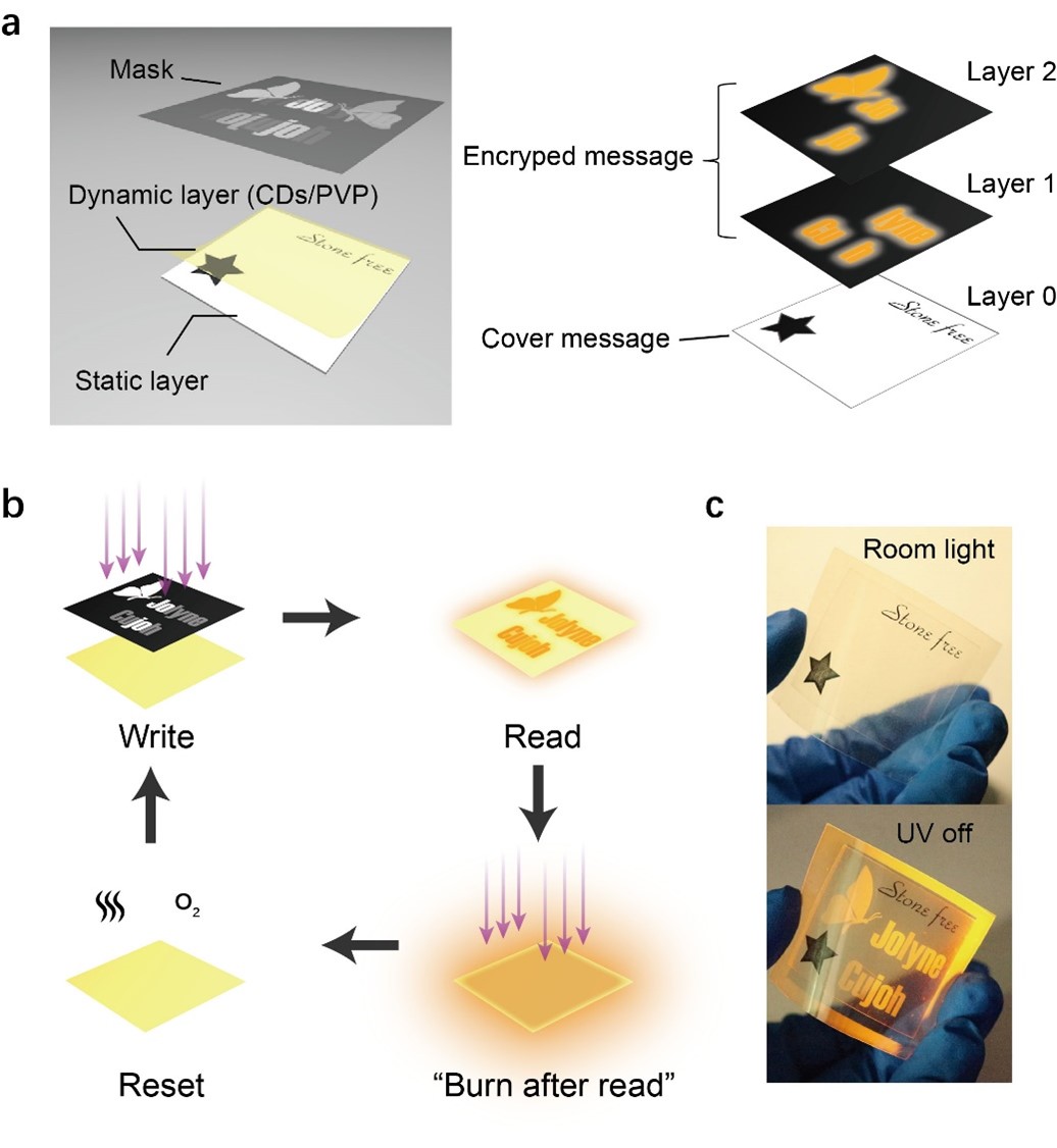 在典型的動態(tài)磷光材料中,磷光體通過光動力過程消耗其所在環(huán)境中的氧氣,并在氧氣濃度較低時顯現(xiàn)逐漸激活的室溫磷光。對于純有機(jī)磷光體,由于ISC效應(yīng)較弱,其動態(tài)磷光的激活曲線前部表現(xiàn)出較高的光照劑量閾值。為解決這一問題,本工作采用了鹵素?fù)诫s的納米碳點材料作為磷光體,提高引入鹵素重原子效應(yīng)增強(qiáng)材料的ISC效應(yīng)。結(jié)果顯示,碳點產(chǎn)生三重激發(fā)態(tài)的效率隨鹵素?fù)诫s量增加而顯著提升、隨之引起磷光效率的增長和激活閾值的降低。通過將碳點與聚乙烯基吡咯烷酮高分子材料(PVP)復(fù)合,課題組進(jìn)一步制備了柔性、透明的低激活閾值動態(tài)磷光薄膜,并通過掩模加工得到了磷光強(qiáng)度和壽命連續(xù)變化的一系列灰階動態(tài)磷光圖案。在此基礎(chǔ)上,通過結(jié)合磷光壽命成像(PLIM)和相圖分析(Phasor plot)完成了對動態(tài)磷光薄膜所記錄多級灰階圖形信息的快速分離解密,還基于材料的動態(tài)發(fā)光特性,實現(xiàn)了高度私密的閱后即焚功能。