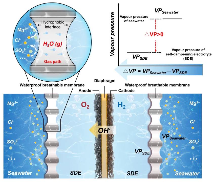 由于淡水資源緊缺,向大海要水是未來氫能發展的重要方向。但復雜的海水成分(約92種化學元素)導致海水制氫面臨諸多難題與挑戰,先淡化后制氫工藝流程復雜且成本高昂。2022年11月30日,謝和平院士與他指導的深圳大學、四川大學博士生團隊在《自然》發表論文,以物理力學與電化學相結合的全新思路,建立了相變遷移驅動的海水無淡化原位直接電解制氫全新原理與技術。該技術徹底隔絕了海水離子,實現了無淡化過程、無副反應、無額外能耗的高效海水原位直接電解制氫,即在海水里原位直接電解制氫。海水無淡化原位直接電解制氫技術未來有望與海上可再生能源相結合,構建無淡化、無額外催化劑工程、無海水輸運、無污染處理的海水原位直接電解制氫工廠。