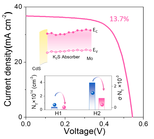 鋅黃錫礦半導體Cu2ZnSn(SSe)4(CZTSSe)同樣是因為其元素廉價無毒以及具有大于32%的理論光電轉換效率成為很有前途的新型薄膜光伏材料之一。近年來CZTSSe薄膜太陽電池的效率不斷攀升,但仍遠低于其理論值,這主要歸因于帶隙和電位明顯的波動,較短的少數載流子壽命以及缺陷引起的嚴重載流子復合;銅銦鎵硒(CIGS)的成熟經驗證明雙梯度帶隙結構使太陽電池兼具良好的電子輸運特性和較高的開路電壓,然而實現雙梯度帶隙結構對高溫硒化成膜的CZTSSe太陽電池來說極具挑戰。本文通過調整前驅體薄膜中K2S層的位置和K2S溶液的濃度,可實現調控帶隙最小值(缺口)的位置和深度,避免由于不合適的前梯度起始位置和不理想的帶隙缺口而產生的電子屏障;晶粒生長過程中K和Se的高親和能容易形成K2Se3等K-Se液體中間相,它們沿著薄膜內的空隙和晶界流動,不僅降低熔點加速硒化,還可作為硒源使薄膜的硒化更加充分;堿金屬K的引入促進了晶粒生長過程中各元素的擴散,使吸收層更大比例的組分參與晶粒生長,從而穩定Sn含量,深能級缺陷VSn和CuSn得到抑制,最終構建出CZTSSe薄膜太陽電池光電轉換效率達到13.7%,屬于國際領先水平,相關研究成果發表在Advanced Functional Materials (2023)2311992(影響因子:19.0,中科院JCR一區,Top期刊),梁廣興和蘇正華為通訊作者,其指導的聯合培養博士生趙云海為第一作者,深圳大學為唯一通訊單位。