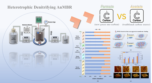 異養反硝化已被用于處理化肥、炸藥和金屬精加工部門產生的含硝酸鹽廢水。為驅動異養反硝化而應用的傳統碳源,不僅成本高昂,而且可能在無意中導致運營中產生的二氧化碳。尋找新的綠色碳源是有必要的。甲酸鹽(一種單碳分子)最近在綠色化學和環境工程領域都受到了關注。甲酸鹽被設想為碳中和生物經濟的核心。電化學CO2氣體固定是碳中性甲酸鹽合成的一種有前途的方法。目前,甲酸鹽在廢水處理中的應用已有文獻記載。然而,它并不是許多細菌的理想碳源和能源。目前,甲酸鹽在驅動異養反硝化中的應用在文獻中仍未得到充分探索。從可持續廢水處理的角度來看,厭氧膜生物反應器(AnMBR)在廢水處理方面比傳統的活性污泥工藝具有明顯的優勢。在為AnMBR開發的多種膜類型中,平板膜組件因其占地面積小、膜更換方便和高效處理而受到關注。然而,AnMBR并非沒有挑戰。膜污染以孔隙堵塞和濾餅層形成為特征,阻礙了AnMBR的廣泛采用。