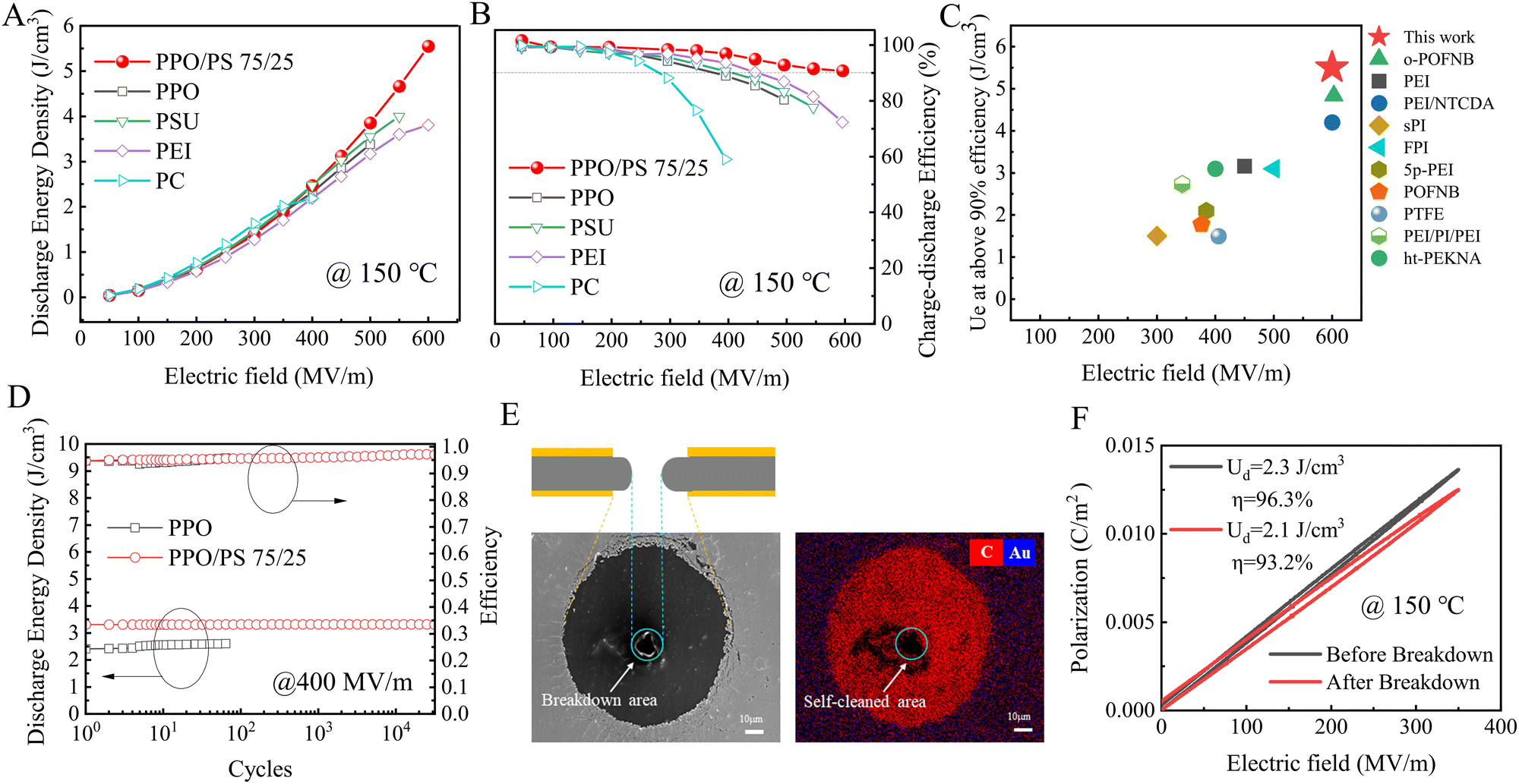 該研究是在前期工作基礎上(Matter,2021,4(7):2448-2459)進行的深入拓展,旨在解決薄膜電容器在高溫下漏電流急劇提升的核心科學問題。研究提出了一種低熵非晶態(tài)聚合物構筑策略。該低熵非晶態(tài)聚合物由高玻璃化轉變溫度的聚(2,6-二甲基-1,4-苯撐氧化物)(PPO)和聚苯乙烯(PS)分子級共混而成,在高溫和高電場下表現(xiàn)出優(yōu)異的電容性能。材料設計原理是利用PS的苯環(huán)與PPO的苯環(huán)之間的強范德華力,在分子水平上“拉伸”主鏈,從而顯著降低非晶態(tài)聚合物的分子構象熵,形成隨機取向但高度緊密堆積的延展聚合物鏈,通過深能級局部態(tài)抑制電荷傳輸。研究結果表明,該低熵非晶態(tài)介電聚合物在150℃下表現(xiàn)出5.5?J/cm3的放電能量密度和超過90%的充放電效率,性能優(yōu)于現(xiàn)有的介電聚合物,并顯示出放電能量密度的兩倍以上的提升。此外,與其他方法相比,該薄膜加工工藝(即聚合物共混)更簡單、直接且成本低,因此該方法為高性能和高質量聚合物薄膜的量產鋪平了道路,這些薄膜在高溫薄膜電容器中具有廣泛應用。