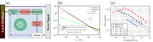 李朝紅團隊基于自主搭建的冷銣原子相干布居數囚禁鐘,利用貝葉斯量子參數估計首次在積分時間尺度上實現了海森堡標度【T^(-1)】的鐘躍遷頻率測量,并用于此原子鐘的閉環鎖定。團隊研究人員通過設計適用于原子鐘鎖定的貝葉斯量子參數估計算法【圖(a)】,利用具有指數增長積分時間的拉姆塞干涉測量序列,同時在貝葉斯迭代過程中自適應調節本地振蕩器的頻率,實現鐘躍遷頻率的測量。經過迭代,貝葉斯估計值趨于鐘躍遷頻率,在積分時間到達最大相干時間前,頻率測量的靈敏度遵循海森堡標度【圖(b)】。進一步,利用基于貝葉斯量子參數估計的鐘躍遷頻率測量,將本地振蕩器頻率直接鎖定在原子躍遷頻率上,實現了原子鐘的貝葉斯閉環鎖定。相對于傳統的PID鎖定,利用貝葉斯量子參數估計鎖定的原子鐘的穩定度提高了5.1(4)dB【圖(c)】。相比美國國家標準與技術研究院報道的穩定度1.3*10^(-11)/τ^(1/2)【Appl. Phys. Lett. 111, 224102 (2017)】、英國斯特拉斯克萊德大學報道的穩定度2*10^(-11)/τ^(1/2)【Optics Express 27, 38361 (2019)】和中國計量科學研究院報道的穩定度2.4*10^(-11)/τ^(1/2)【Chin. Phys. B 31, 043201 (2022)】,李朝紅團隊利用貝葉斯量子參數估計得到的穩定度為4.3*10^(-12)/τ^(1/2),是目前冷原子相干布居數囚禁鐘的最高穩定度。此外,基于貝葉斯量子參數估計的原子鐘鎖定對技術噪聲具有極好的魯棒性。